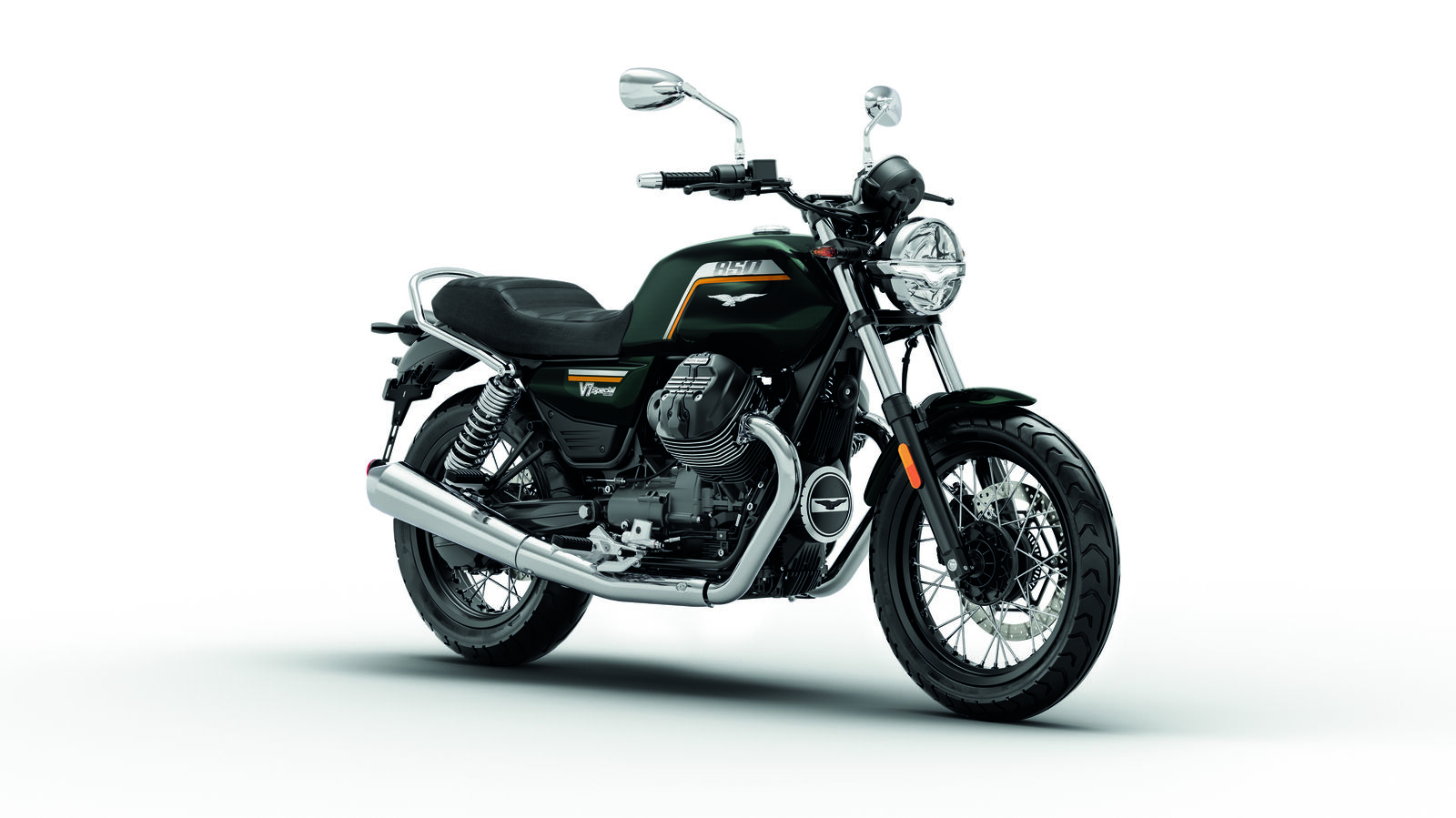 V7 Sport – und Grigio Lario in Pastelloptik erhältlich. Die V7 Stone präsentiert sich in den markanten Tönen Blu Profondo und Nero Ruvido. Ein neu gestaltetes Logo auf den Seitenteilen und die dynamischen Sechs-Speichen-Gussräder ergänzen das reduzierte Design ebenso wie der schlichte Sattel. Die V7 Special bleibt dem Erbe des Originalmodells treu und verbindet klassischen Charme mit eleganter Raffinesse. Mit zahlreichen verchromten Details und zwei auffälligen Hochglanzfarben – Nero Smeraldo und Bianco 1969 – strahlt sie zeitlose Eleganz aus. Polierte Speichenräder mit schwarzen Naben runden den Look ab. Darüber hinaus beeindruckt sie mit gefrästen Zylinderkühlrippen und einem klassich-gerippten, schwarzen Sattel.