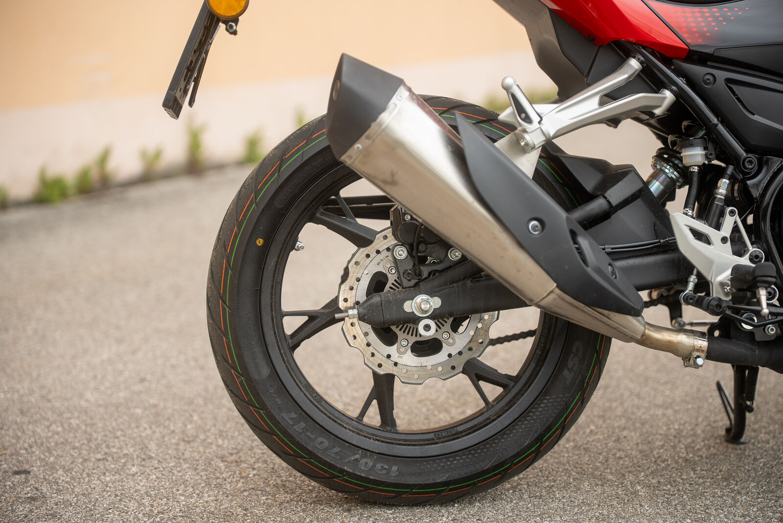 Bei der Fahreigenschaft der SRK 125R wurde viel Wert auf Agilität und Komfort gelegt. Die Maschine lässt sich mühelos durch enge Kurven lenken und bietet gleichzeitig ausreichend Stabilität auf geraden Strecken. Die Federung ist mit KYB-Komponenten ausgestattet, die für ein angenehmes Fahrgefühl sorgen, allerdings könnte die Vorderradgabel etwas straffer abgestimmt sein, um mehr Feedback an den Fahrer zu geben. Die Clip-On-Lenker sorgen für eine aufrechte, komfortable Sitzposition, die es dir ermöglicht, sowohl sportlich als auch entspannt zu fahren. Ein weiterer Pluspunkt ist der gute Grip der CST-Reifen, die, obwohl sie eher preiswert sind, für die meisten Fahrbedingungen ausreichend sind. Wer jedoch auf sportliches Fahren Wert legt, sollte in hochwertige Reifen investieren, um die Leistung der SRK 125R voll auszuschöpfen.