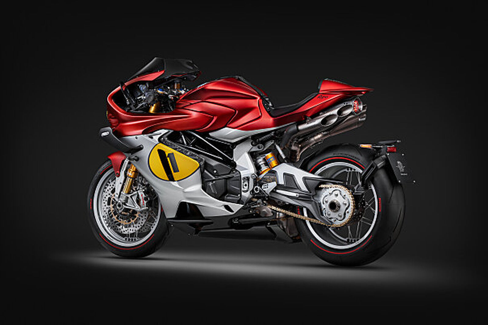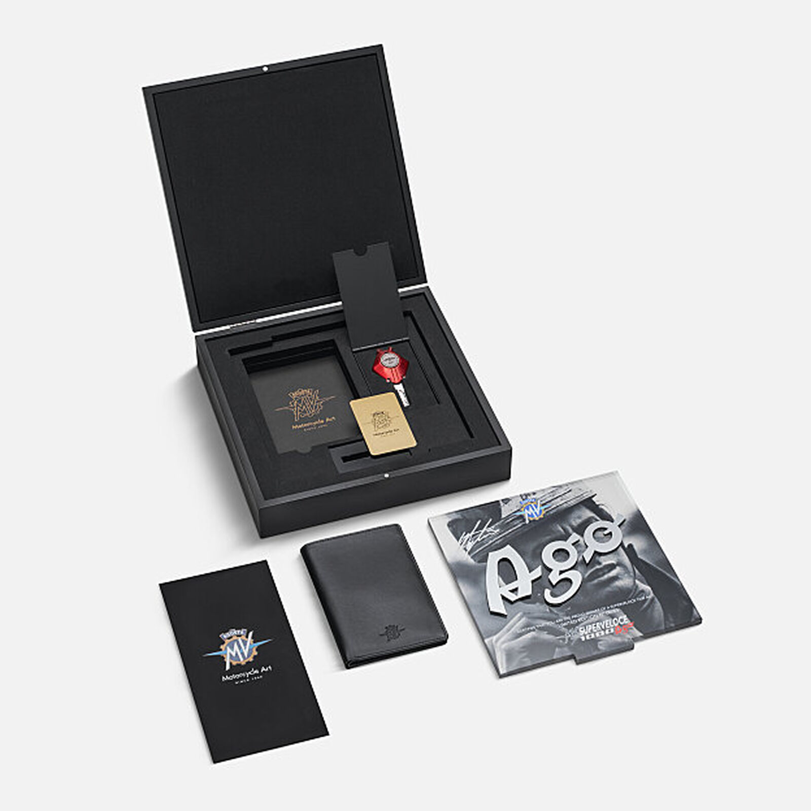 Die Superveloce 1000 Ago ist MV Agustas Hommage an Ago und erscheint 2025, im Jahr des 80-jährigen Markenjubiläums. In den acht Jahrzehnten, in denen sich MV Agusta zur exklusivsten Motorradmarke der Welt entwickelt hat, war Giacomo Agostini zweifellos der wichtigste Name, der mit ihr verbunden ist. Zur Feier von Agostinis 83. Geburtstag im Jahr 2025 bringt MV Agusta die Superveloce 1000 Ago heraus – eine limitierte Auflage von nur 83 Einheiten weltweit. Jedes Motorrad ist persönlich von Agostini signiert und, wie alle Limited Editions von MV Agusta, einzeln nummeriert von 1 bis 83, auf einer echten Goldplakette am Steuerkopf. Jede Einheit wird von einem Echtheitszertifikat mit derselben Nummer begleitet. Die Superveloce 1000 Ago verfügt über ein bisher einzigartiges Detail für ein Serienmotorrad: Ein Teil jedes Motorrads wird aus einem von Giacomo Agostini gewonnenen Pokal gefertigt. Das Gehäuse des Zündschlüssels besteht aus zwei in auffälligem Rot eloxierten Schalen, die aus einem Aluminiumblock gefräst wurden. In einer der Schalen sitzt eine Messingmünze. Sie wurde aus dem Material eines Pokals geformt, den Giacomo Agostini gewonnen hat. Ago selbst wählte den Pokal aus seiner Sammlung aus und schenkte ihn MV Agusta, wodurch die Marke ihren Kunden mit der Superveloce 1000 Ago ein echtes Stück Rennsportgeschichte bieten kann.