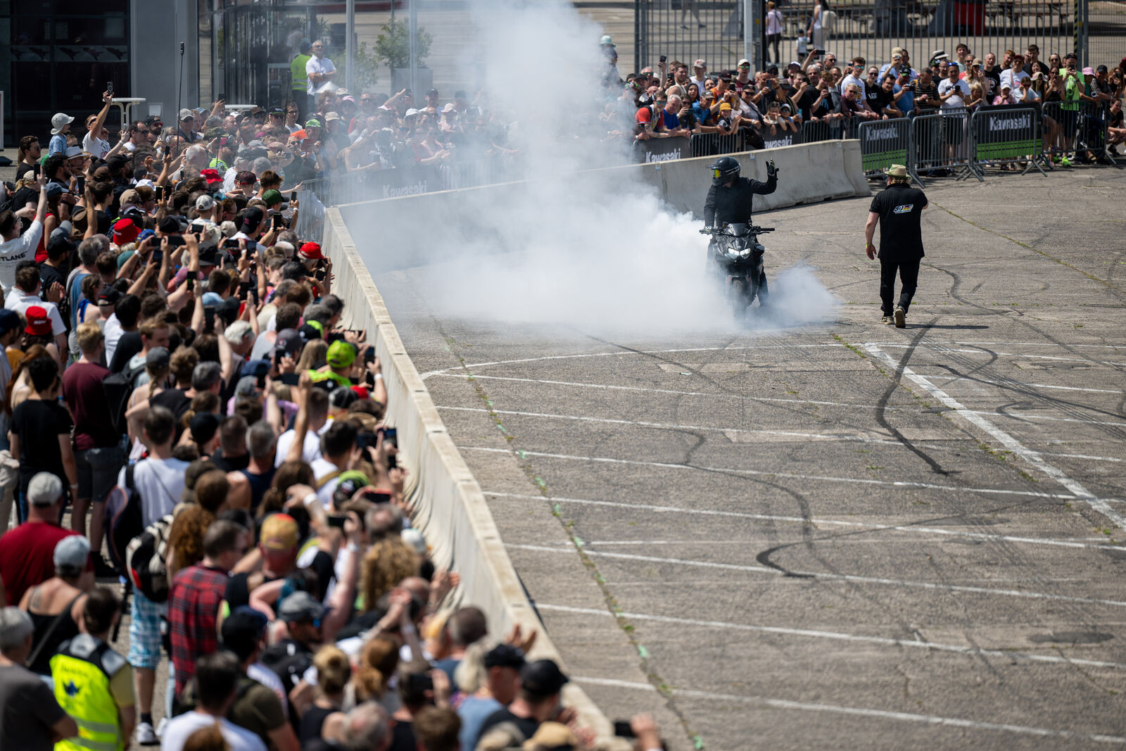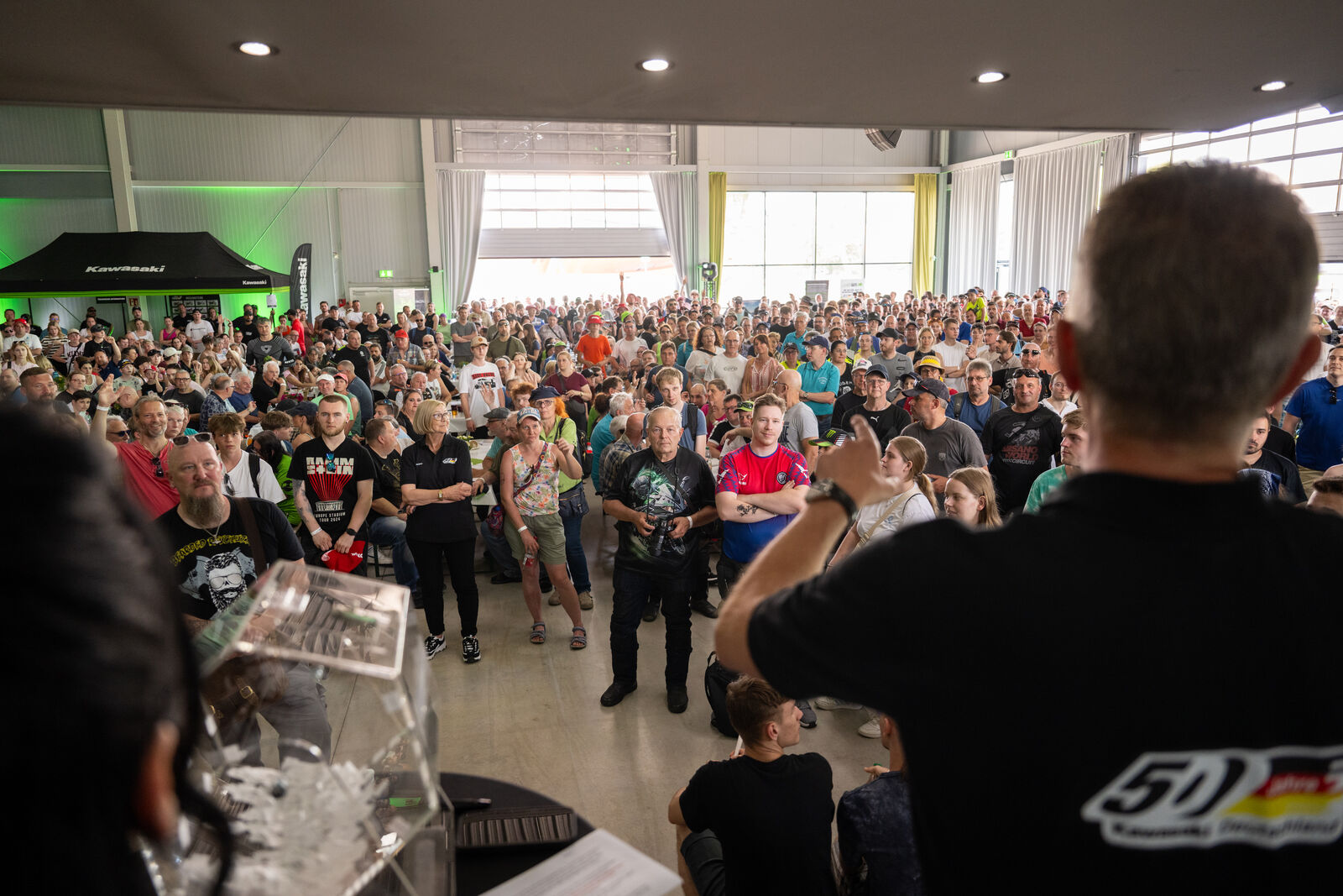 Ein wesentliches Thema im Eventhangar und auf der dortigen Bühne stellte das Jubiläum „50 Jahre Kawasaki Deutschland" dar. In einer kleinen Sonderausstellung waren dazu einige echte Motorrad-Meilensteine zu sehen. Außerdem gaben Kawasaki-Urgesteine wie der Ex-Werkstattleiter Gerd Sinn und der ehemalige Leiter Homologation und Produkterprobung, Horst Uffelmann, im Interview mit Moderator Andi Seiler interessante Hintergründe aus der Firmenhistorie zum Besten. Rennsportlegende Toni Mang berichtete darüber hinaus aus seiner aktiven Zeit mit Kawasaki und verteilte unzählige Autogramme. Darüber hinaus bot das Eventgelände viele Highlights wie Stuntakrobatik, Freestyle- und Dragster-Shows sowie Steilwandfahrer-Action. Reifenhersteller Bridgestone, Kawasakis Schmierstoffpartner MOTUL und der Radiosender Rock FM führten Gewinnspiele an ihren Ständen durch. Außerdem gab es kostenlose Airbrush-Tattoos, und verschiedene Kawasaki-Vertragspartner präsentierten Custom-Bikes und Zubehör-Artikel. Aktuelle Kawasaki-Motorräder konnten selbst getestet werden, insgesamt fanden 220 Probefahrten statt. Alternativ stand ein Moto-Simulator für gefahrlose Schräglagentests zur Verfügung. Auch an die kleinen Gäste hatte man gedacht, sie konnten auf einem Testparcours mit KFX90-Quads üben oder sich auf einer Hüpfburg austoben.