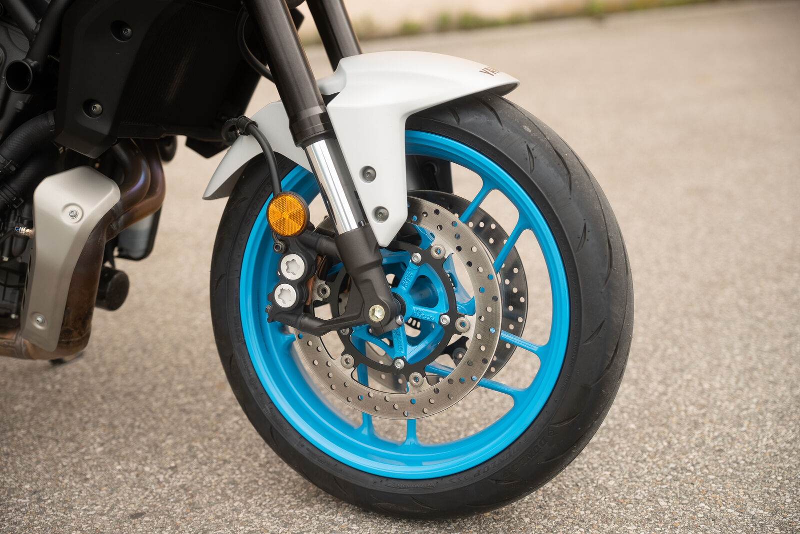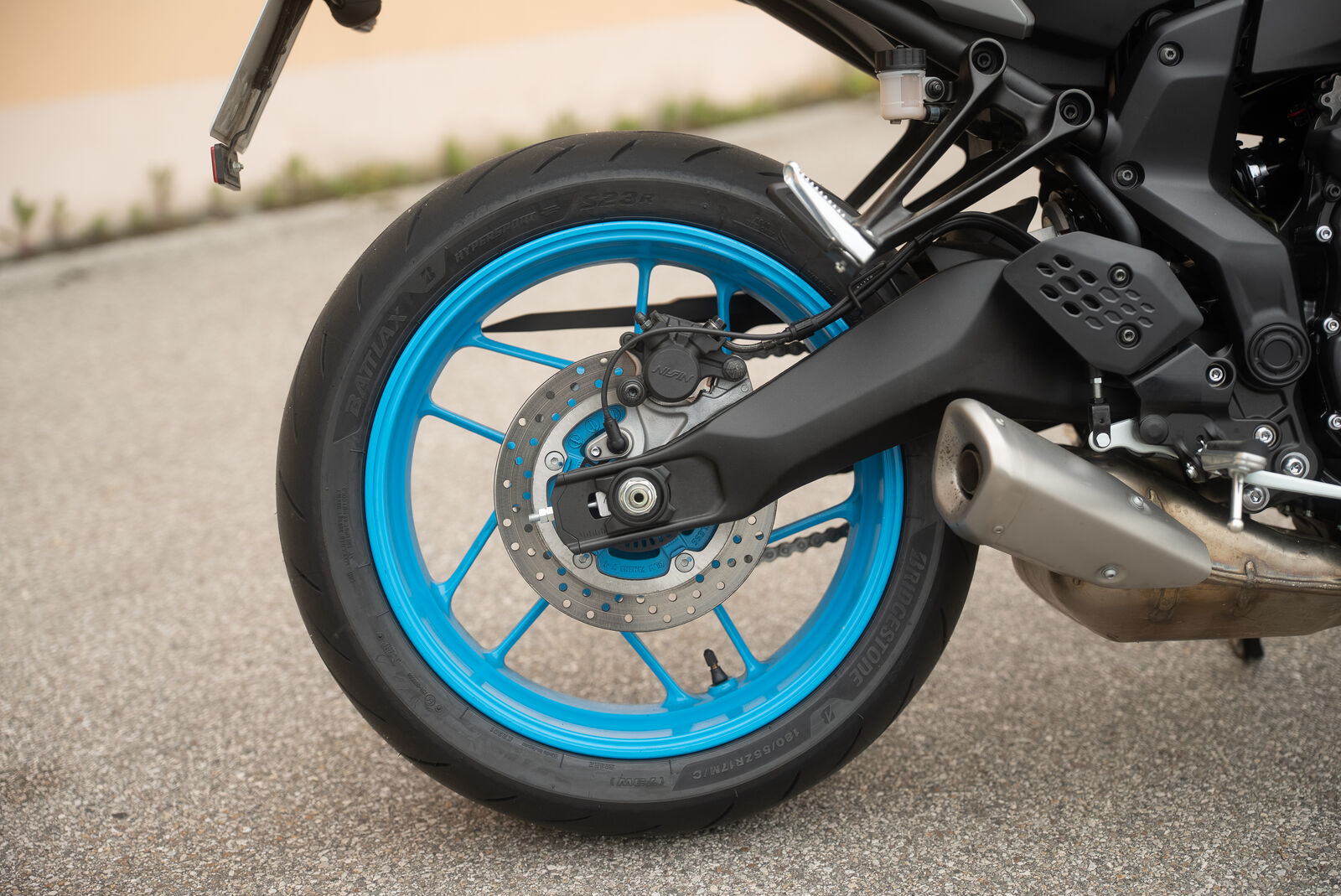 Das Fahrwerk der Yamaha MT-07 ist auf sportliches Fahren ausgelegt. Mit einer 41-mm-Upside-Down-Gabel und einem einstellbaren Monoshock hinten bietet sie eine komfortable Federung, die auch auf unebenen Strecken gut funktioniert. Das geringe Gewicht von nur 184 kg sorgt dafür, dass die Maschine äußerst wendig ist und sich mühelos durch Kurven manövrieren lässt. Die Sitzposition ist sportlich, wobei die kurze Radstand von 1.400 mm für zusätzliche Agilität sorgt. Allerdings könnte die Ergonomie für größere Fahrer etwas beengend wirken. Die MT-07 richtet sich klar an Fahrer, die ein kompaktes, leichtes Motorrad suchen, das sich auch im Stadtverkehr hervorragend schlägt.