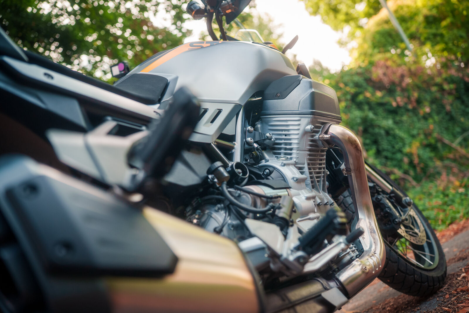 Die Stelvio besitzt einen quer eingebauten V2-Motor mit 1.042 cm³ Hubraum, 115 PS Leistung und 105 Nm Drehmoment – inklusive Kardanantrieb. Der Motor zeigt seine Stärke besonders in mittleren Drehzahlen: kraftvoll, linear, emotional und mit Druckreserve, gerade für Touren oder wenn man zu zweit unterwegs ist. Im unteren Bereich arbeitet der Quickshifter nicht optimal, hier ist der Druckpunkt etwas hastig, allerdings häufig nur relevant bei langsamen Drehzahlen. Im Alltag und auf der Landstraße erweist sich das Ansprechverhalten als fein dosierbar, Lastwechselreaktionen sind gering, und elektronische Systeme wie Traktionskontrolle, Kurven-ABS, Engine Brake und verschiedene Fahrmodi (Touring, Sport, Rain, Road, Offroad) unterstützen spürbar. Ein Kritikpunkt ist die Hitzeentwicklung des Motors bei längerer Fahrt, die teilweise spürbar wird, ohne jedoch unangenehm stark zu sein.