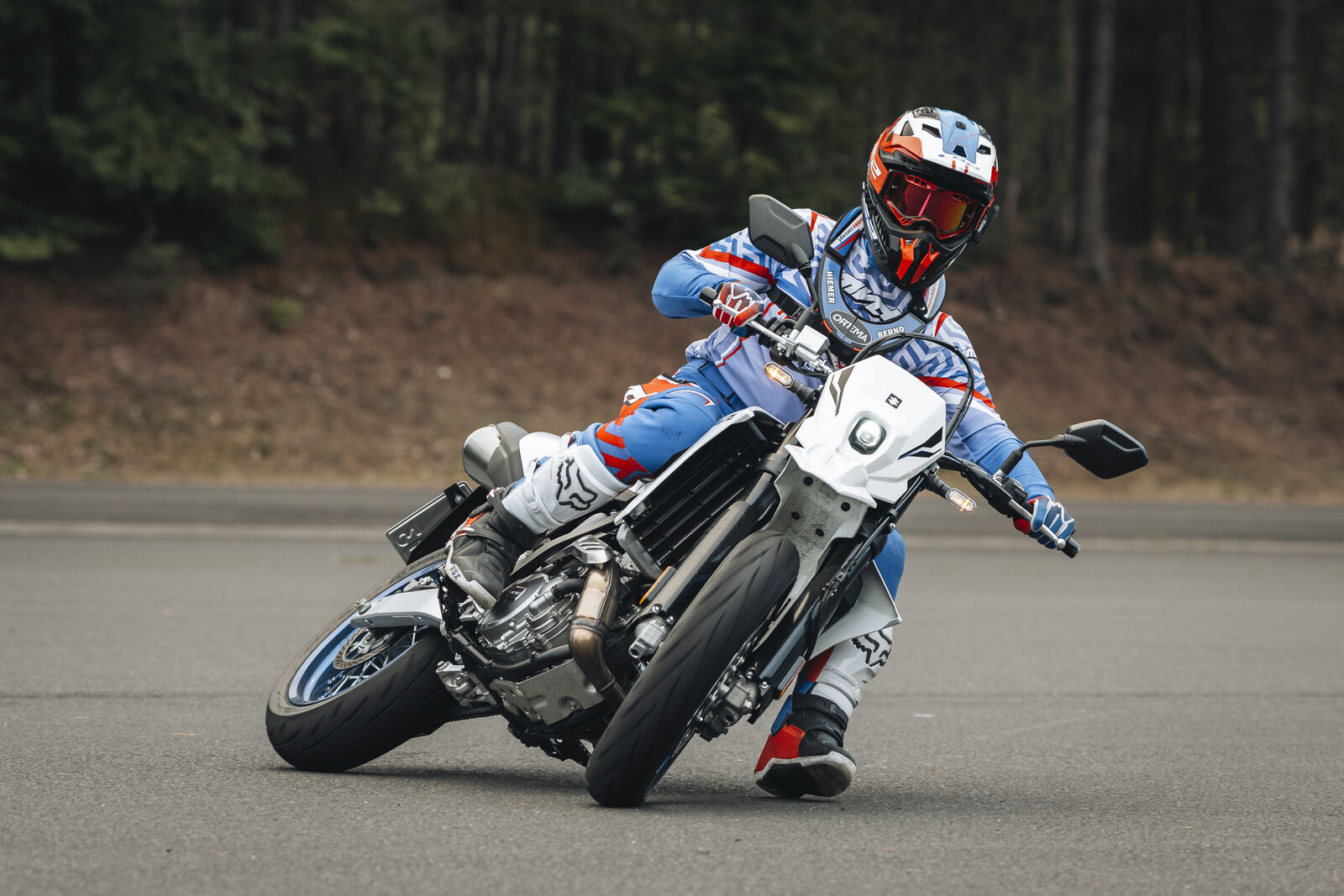 Die Suzuki DR-Z4SM ist wie gemacht für Supermoto-Fahrtechnik. Mit ihrem 38-PS-Einzylinder, dem leichten Handling und dem präzisen Fahrwerk bietet sie ideale Voraussetzungen, um neue Techniken schnell zu verinnerlichen. Besonders wichtig: Das ABS am Hinterrad lässt sich deaktivieren – ein entscheidendes Feature für echte Supermoto-Manöver wie kontrolliertes Sliding. Die Kombination aus 310-mm-Bremsscheibe, radial montiertem Bremssattel und langen Federwegen sorgt für klare Rückmeldung und hohe Stabilität. Dazu kommen drei Fahrmodi, Straßenhomologation und robuste japanische Technik. Ein Bike, das Fehler ehrlich zeigt, aber nie überfordert.