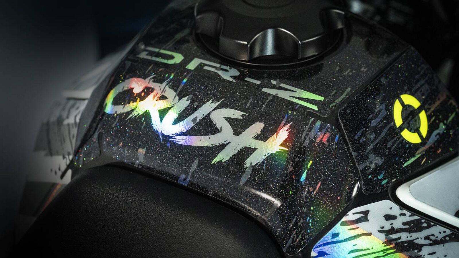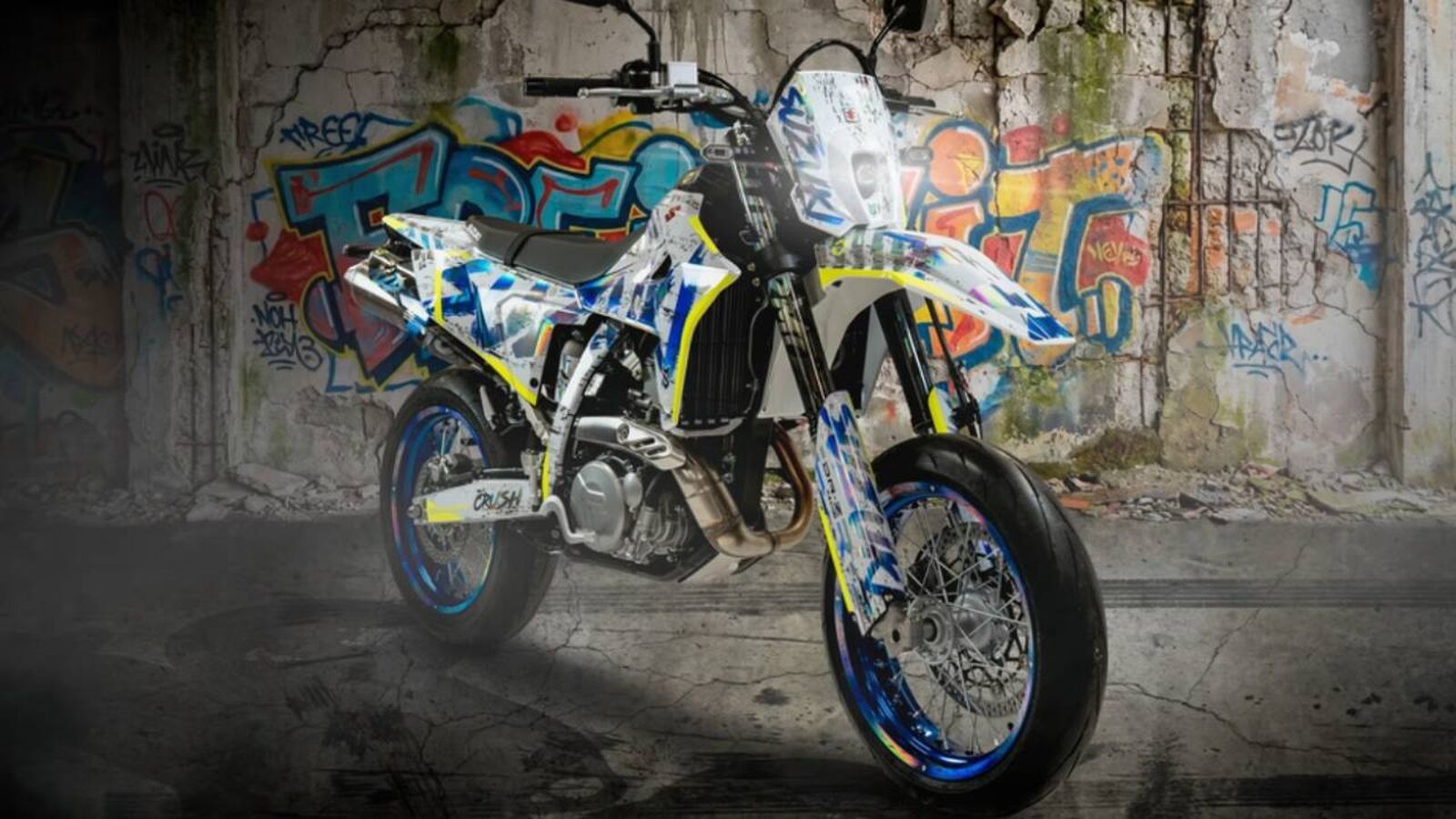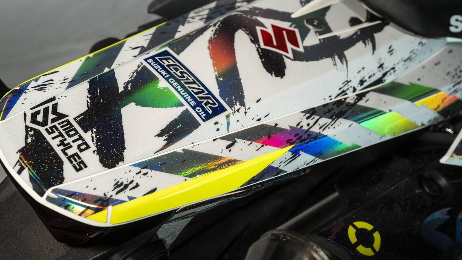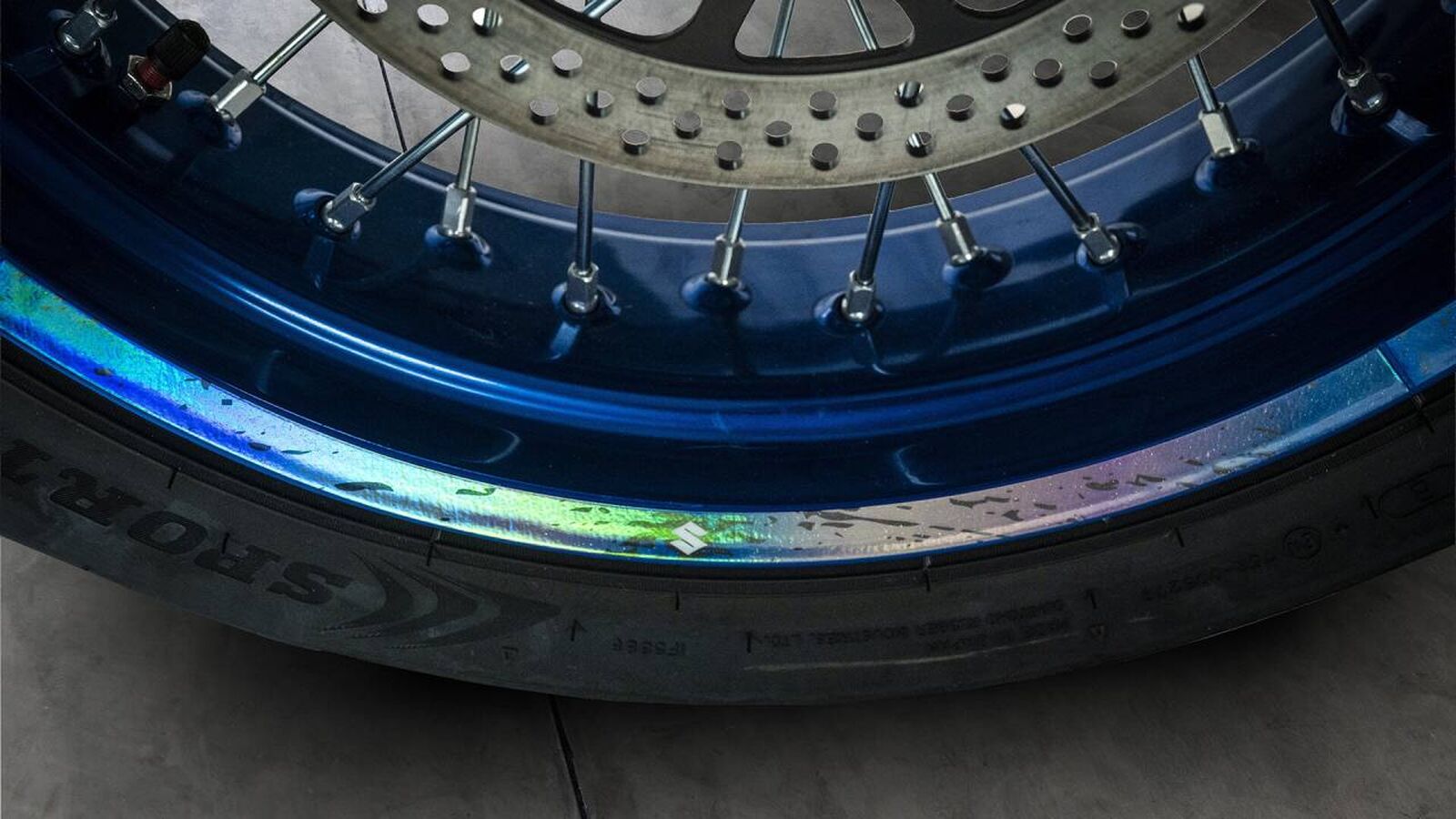 Und jetzt kommen wir zu meinem persönlichen Highlight: der DR-Z4SM Crush Edition. Eine Supermoto mit richtig geiler Beklebung. Wichtig: Die ist nicht limitiert. Ihr könnt bei eurem Suzuki-Händler jederzeit dieses Sticker Kit gemeinsam mit dem Motorrad kaufen. Das Geniale ist, sie kommt komplett professionell beklebt – ihr müsst nichts selbst machen. Highlights sind der große Suzuki-Schriftzug, der beklebte Rahmen, der Schutz für den Ausgleichsbehälter, Felgensticker mit Holo-Effekt, alles blasenfrei verarbeitet. Es gibt eine weiße Version und eine blau-graue Variante, bei der die Farben gespiegelt sind. Preislich liegen wir bei rund 750 Euro für das komplette Kit inklusive Montage. Alle Originalteile bekommt ihr mit, Rückbau ist jederzeit möglich, alles ist straßenzugelassen und es gibt keinen Stress mit der Polizei. Am Ende des Tages zeigt Suzuki wieder, wie viel man für vergleichsweise wenig Geld herausholen kann – optisch wie technisch.
