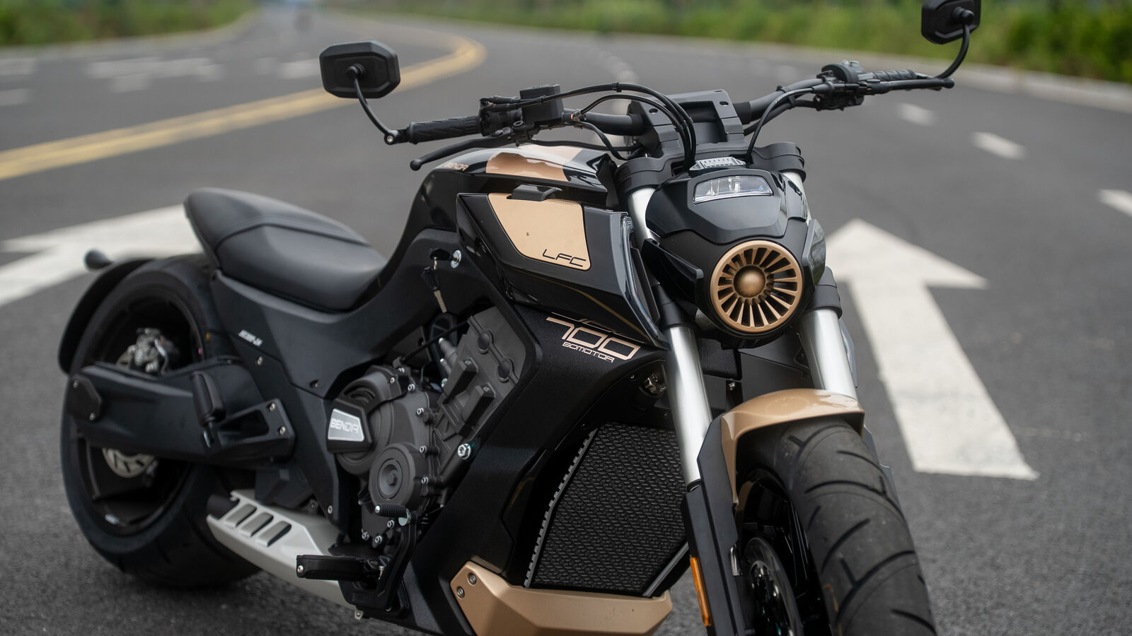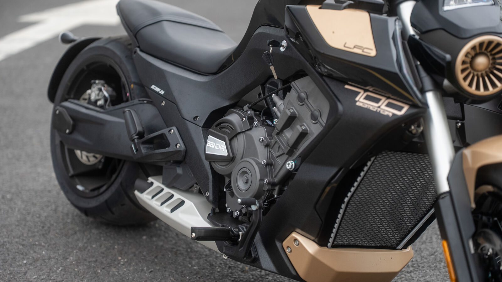 Angetrieben wird die LFC 700 Pro weiterhin von einem Vierzylinder-Reihenmotor – eine Seltenheit im Cruiser-Segment. Die Gasannahme zeigt sich in der Serie deutlich kultivierter als noch bei frühen Prototypen. Der Motor läuft sauber, spricht weich an und wirkt insgesamt einsteigerfreundlich. Gleichzeitig bringt das Aggregat eine akustische Eigenständigkeit mit, die eher an sportliche Naked Bikes erinnert als an klassische V2-Cruiser. Fahrdynamisch profitiert die Pro vom Wechsel auf einen 300er-Hinterreifen statt des bisherigen 310ers. Das reduziert Kosten und erweitert die Reifenauswahl, ohne den brachialen Look zu verwässern. Zwar bleibt das Handling aufgrund der enormen Dimensionen speziell, doch insgesamt wirkt das Bike etwas agiler und zugänglicher.