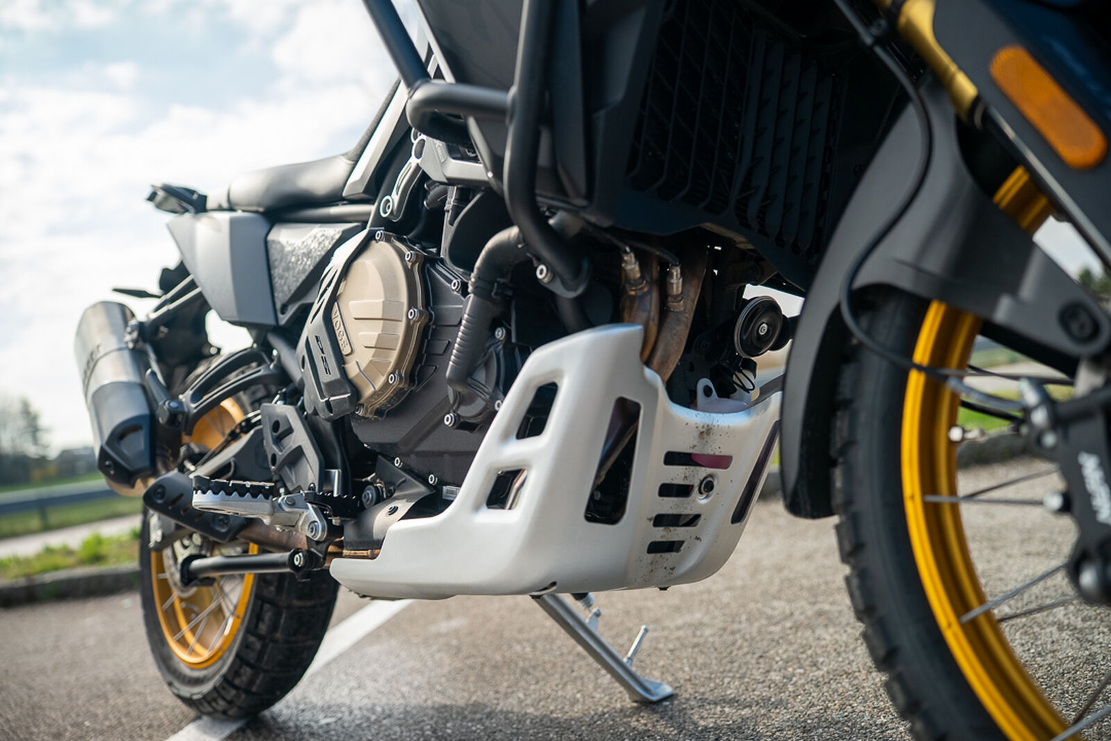 Was hier unter dir arbeitet, ist fast schon eine Kampfansage. Stahl-Brückenrahmen, KYB-Komponenten, voll einstellbar vorne wie hinten. 198 mm Federweg, 227 kg vollgetankt. Kreuzspeichenräder, Pirelli Scorpion Rally STR – das Setup passt. Und wie! Auf der Straße ein sattes Gefühl, im Gelände pure Freude. Das Fahrwerk schluckt alles, wirkt stabil und gleichzeitig komfortabel. Fast wie auf Wolken. Klar, vorne taucht sie beim Bremsen ein – ein bisschen wie ein Schiff, aber irgendwie charmant. Der Vergleich zur Tenere liegt nahe, und ganz ehrlich: Hier wird richtig geliefert. Für die Preisklasse fast schon Benchmark. Einziger Haken: Der große Tank hebt den Schwerpunkt spürbar an. Doch die Gewichtsverteilung bleibt ausgewogen – rund 235 kg voll ausgestattet. Kein Leichtgewicht, aber stimmig. Und vor allem: ein echtes Grinsen-Garantie-Paket.