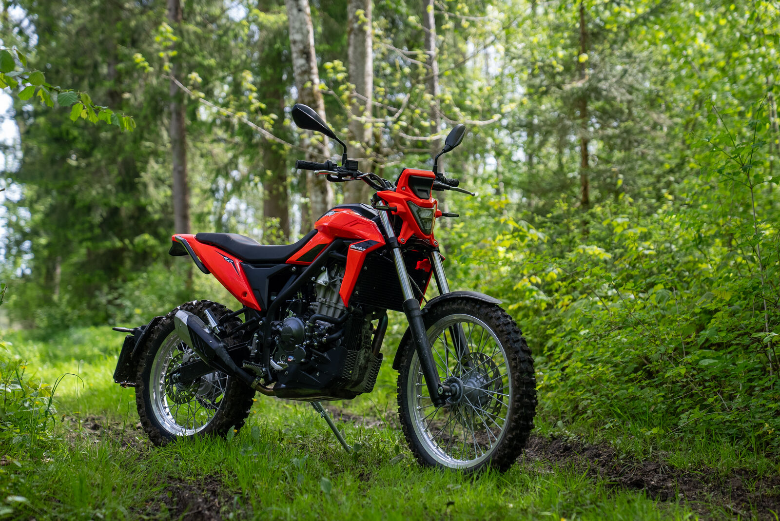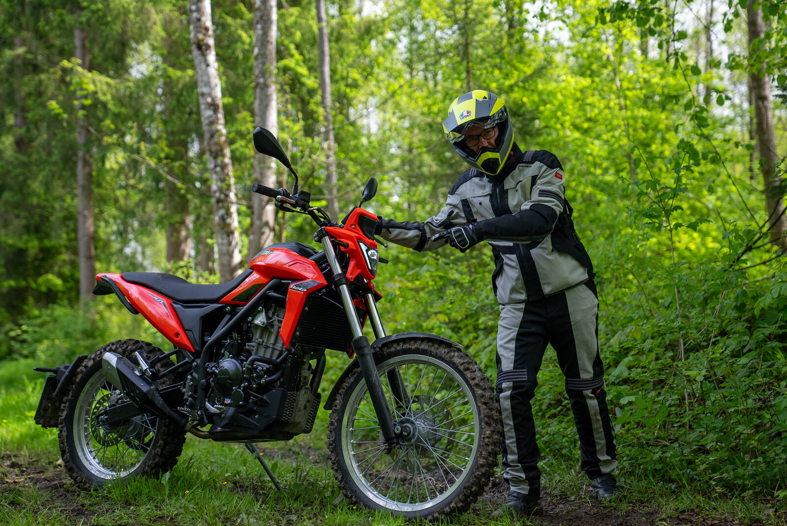 Natürlich darf man nicht erwarten, dass der kleine Motor ein Kraftprotz ist. Man sollte die Alp auch nicht mit einer Sportenduro verwechseln. Aber ab 4.000 Touren legt der Motor richtig los und man kommt überall rauf und runter. In der Originalausstattung sind Reifen von VR Rubber montiert. Die Dimension vorne mit 90/90 und hinten 140/80 ist ein Standardmaß für Enduros, sodass man aus einer Vielzahl von Reifen wählen kann. Für mich hat die Kombination mit einem Reifendruck vorne von 1,5 Bar und hinten 1,7 Bar sehr gut gepasst. Ich hatte sowohl auf Schotter den richtigen Grip und bin auch sehr gut durch die Kurven gekommen, ohne viel zu rutschen.