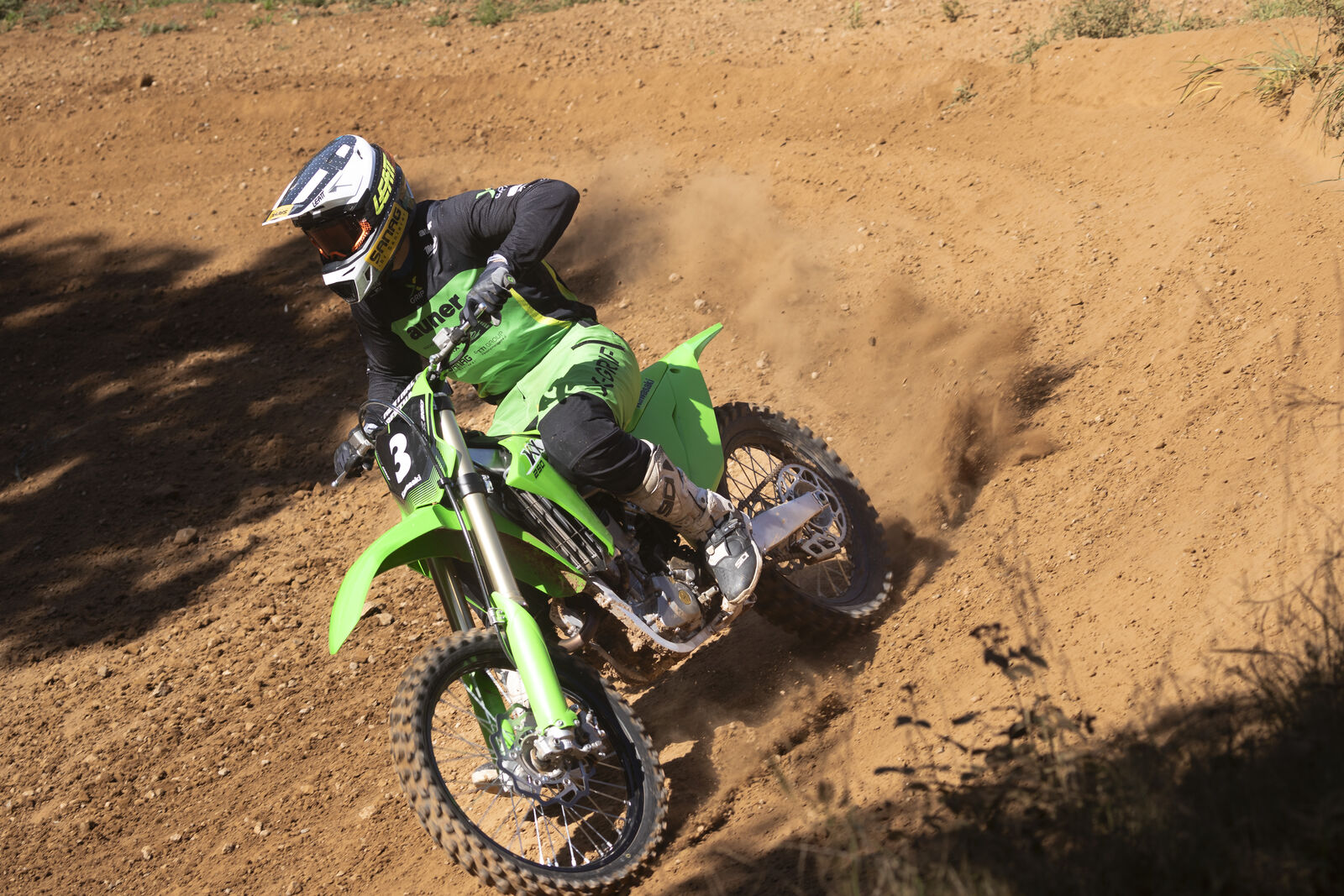 Das Fahrverhalten der KX250F ist einfach beeindruckend. Mit vier Sessions auf einer trockenen Hartstrecke konnte ich die Kraft des Motors und die Stabilität des Rahmens ausgiebig testen. Die Gabel lässt sich leicht anpassen, was dir ermöglicht, den Schwerpunkt nach deinen Vorlieben zu justieren. Ein kleiner Tipp: Wenn du den Gabeldurchschritt um ein paar Millimeter erhöhst, verbessert sich das Kurvenverhalten erheblich.
