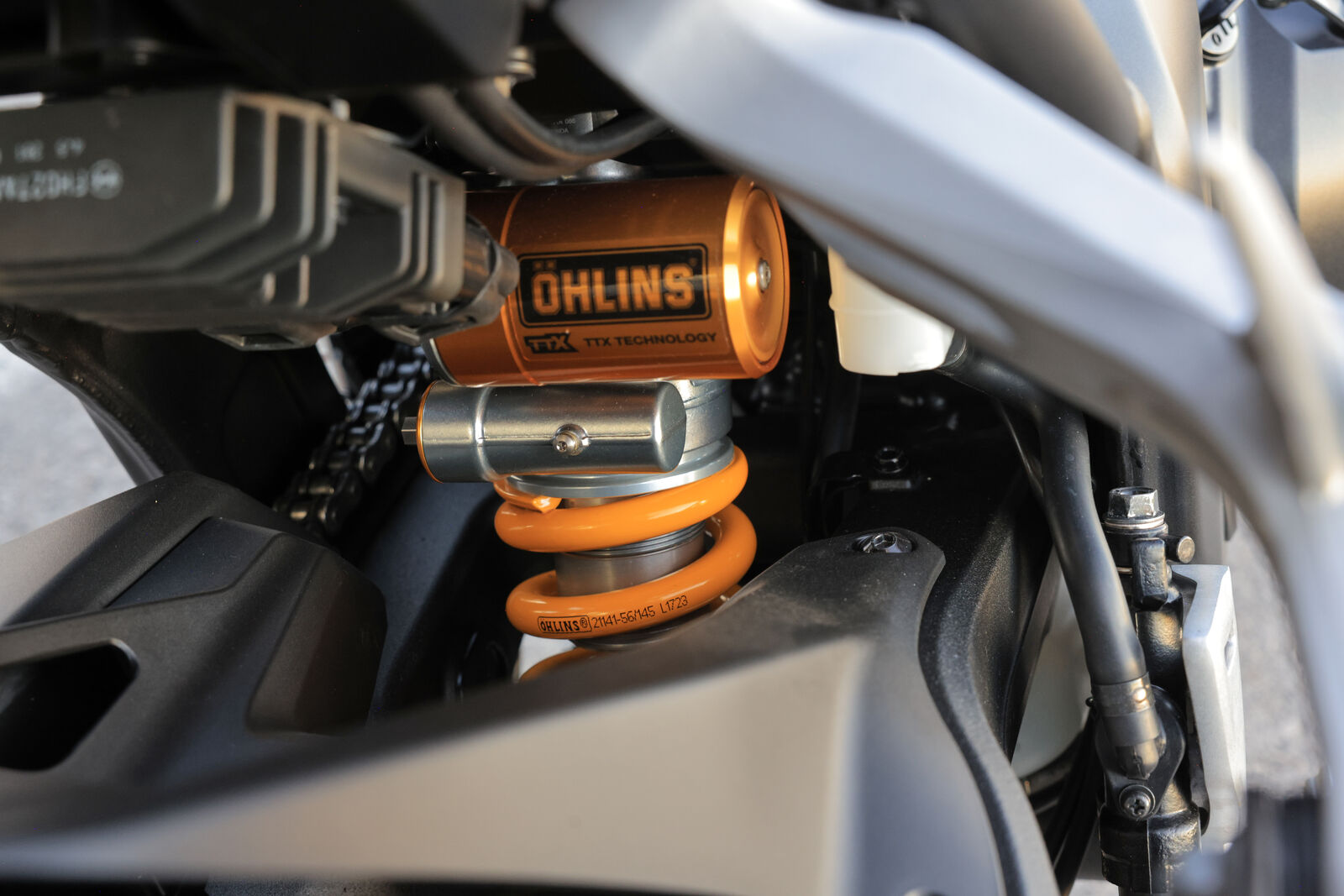 Das Fahrwerk der Hornet SP ist ein weiteres Highlight. Die SP-Version ist mit einem hochwertigen Öhlins TTX36 Stoßdämpfer ausgestattet, während die Standardversion mit einem einfacheren Stoßdämpfer auskommt. Die Showa Big Piston Gabel mit 41 mm Durchmesser bietet sowohl vorne als auch hinten eine einstellbare Dämpfung, die sich gut an unterschiedliche Fahrbedingungen anpassen lässt. Die Sitzhöhe von 809 mm und die schmale Taille sorgen dafür, dass auch kleinere Fahrer gut mit der Hornet zurechtkommen. Der Radstand von 1456 mm und der Lenkkopfwinkel von 25° ermöglichen ein schnelles Einlenken und eine agile Fahrweise. Dennoch sollte man beachten, dass die Schräglagenfreiheit nicht immer optimal ist und bei unsachgemäßer Fahrweise die Fußrasten möglicherweise den Boden berühren.