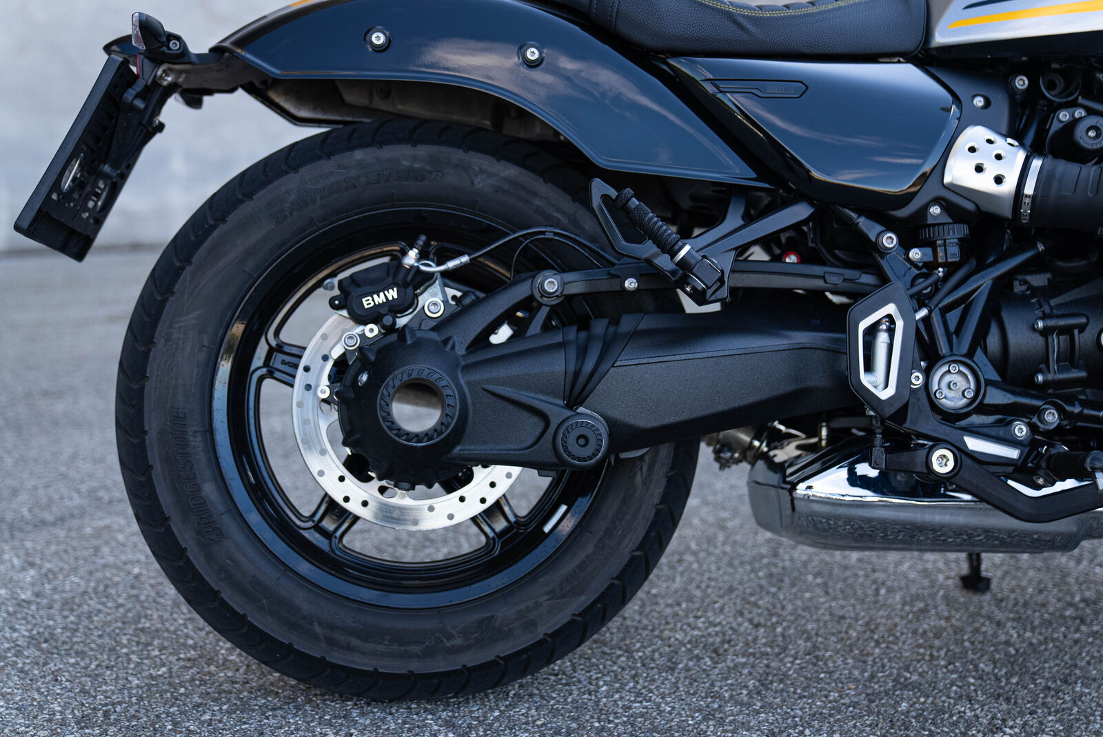 Die BMW R 12 2024 verfügt über eine 45 mm USD-Gabel vorne und ein Zentralfederbein hinten, die zusammen mit einem Federweg von 90 mm für ein komfortables Fahrerlebnis sorgen. Das Fahrwerk ist neutral abgestimmt, was für Stabilität und ein angenehmes Fahrgefühl sorgt, selbst auf unebenen Straßen. Die Einarmschwinge trägt zudem zur modernen Optik und zum Handling bei.