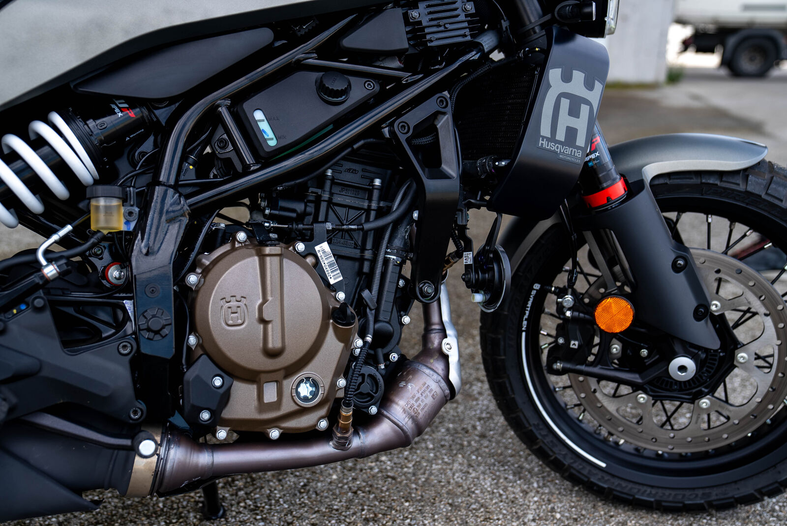 Das Fahrwerk der Svartpilen 125 2024 stammt von WP und bietet mit 150 mm Federweg vorne und hinten eine hervorragende Neutralität und Stabilität. Die Abstimmung ist etwas weicher als bei der Duke 125, was das Motorrad tourentauglicher macht. Trotz der leichten Stollenreifen behält die Svartpilen in verschiedenen Fahrsituationen ihre Kontrolle und Stabilität.