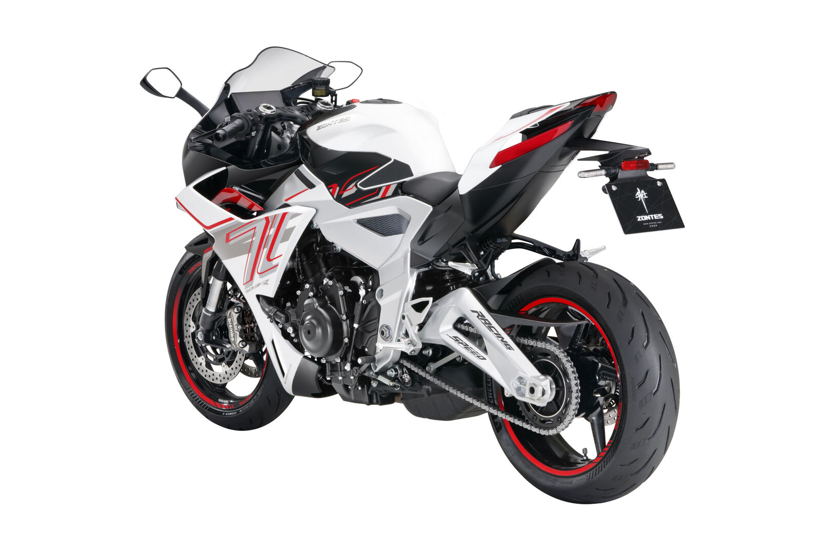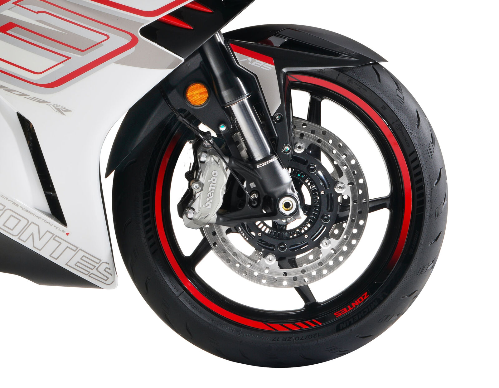 Die Zontes 703 RR 2025 ist mit hochwertigen Aluminium-Druckgussfelgen ausgestattet. Sie fährt vorne auf 120/70-17 und hinten auf 180/55-17 Reifen, die für eine optimale Straßenhaftung und ein sportliches Fahrverhalten sorgen.